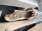 大屋根の木材の傷みは予想以上にひどいものでした。宮大工方によって悪い部分は切り取られ新しい太い木材及び鉄板等で補強がなされましたが、切り取られ地上に下ろされた木材はシロアリでスカスカ状態(写真【1】【2】)、「よく、これで保ってたな~」とオギ棟梁は一言。