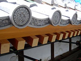 現在その彫刻は、菊間町の渡部鬼瓦工場の鬼師・渡部一馬氏【写真1】によって製作中で、その視察で行きました。覚照寺は横幅十間なのでその屋根に横たわる龍の彫刻はすばらしいものでした。阿吽・つまり本堂に向かって右手より空から舞い降りる龍【写真2】と、左手海より空に向かう龍【写真3】が真ん中の西本願寺の紋・下がり藤【写真4】で向かい合います。渡部鬼師の丹誠込めた力作です。