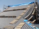 大屋根の下地も完成し、いよいよ山下コンクリート瓦工業による軒先周りの瓦葺き作業(写真【3】【4】【5】)が始まりました。