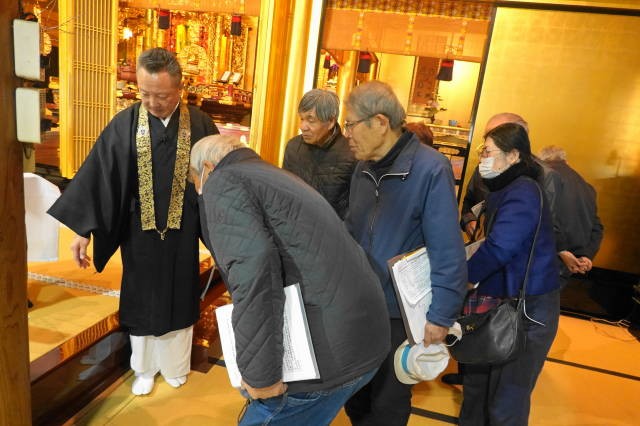 住職が伝え聞く、米軍による岩川への機銃掃射の話や覚照寺の歴史などをお聞きいただき、その後、堂内に残る機銃掃射の弾痕や写真を見学されました。